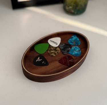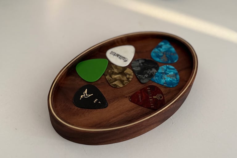 Join the private list today and be automatically entered to win this custom walnut pick tray with brass inlay from the Cruz Stands archive.